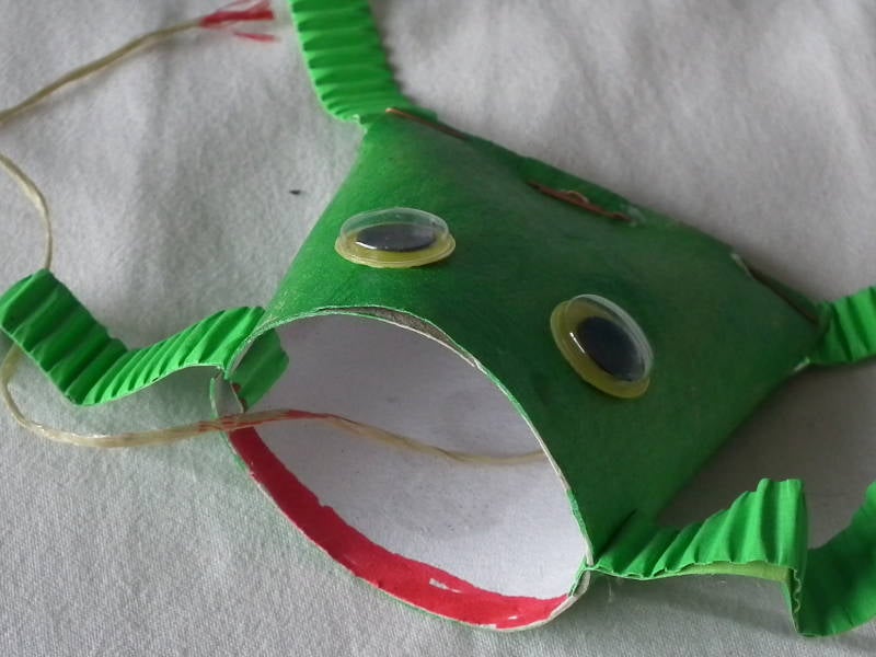 Kikkers zijn belangrijk als schakel in de kringloop. Als er te weinig kikkers leven, heeft dat grote gevolgen voor andere dieren in de natuur. Gelukkig wordt het buitenwater steeds schoner. Maar de Padden hebben het zwaar om van het ene natuurgebied naar het ander te gaan. Vele padden worden doodgereden. kikkerdril vind je nu niet meer, maar eigeel lijkt wel heel erg veel op dril. Dit had ik mee genomen. Met de lange tong vangen kikkers o.a. vliegen. Deze lange tong rolt de kikker in een zeer snel tempo naar buiten. Het puntje is kleverig, daarmee vangen ze de vliegen Een oprol toeter kun je hiermee vergelijken. Op de linkse foto is te zien wat de kinderen zelf hebben gemaakt. De tijd vloog voorbij. Ik had nog een leuk spel in petto. Van A naar B springen als een kikker. op de terugweg neem je in de mond een ballontje mee.