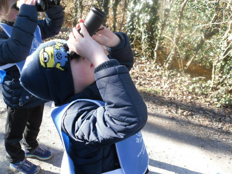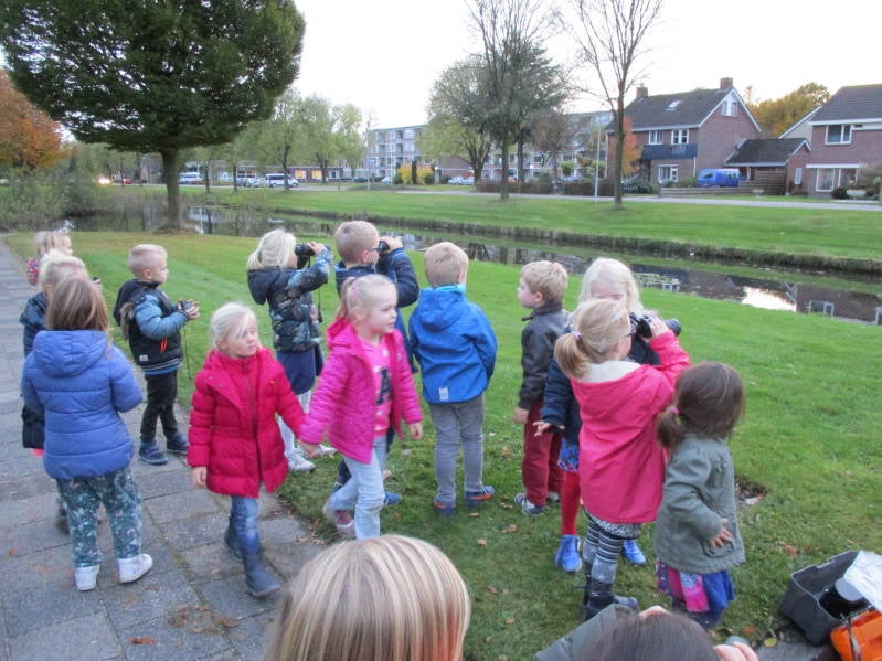 Vogels kunnen zich niet aankleden, hoe doen die dat dan? Zij gaan trekken naar andere delen op deze aardbol, om naar voedsel te zoeken. Dat noemen we vogeltrek. Ze vliegen wel 1000 tot 3000 km, een zware tocht. Maar ze zijn slim en maken van elkaar gebruik door in een V-Vorm te vliegen. De voorste heeft het zwaarst maar ze losten elkaar steeds af, een super teamwork. Met een propeller konden de kinderen dit ook zelf ervaren. In deze educatieve dieren les lag de nadruk veelal op ervaren. Buiten bij de vijver mochten de kinderen naar vogels spotten door middel van een verrekijker. De meeste kinderen hadden nog nooit door een kijker gekeken. Een super middag.