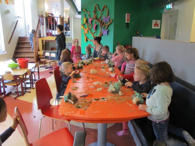 Voor vogels die leven in een stad is het niet altijd makkelijk om veertjes, takjes en ander zachte spulletjes voor hun nestje te vinden. Ik had een aantal nestjes van vogels meegenomen. De kinderen konden zien en voelen hoe een nest van bijvoorbeeld een Merel is gemaakt. Gras, aarde en mos een merel gebruikt dit veel voor zijn opbouw nestje. De koolmees zoekt kleinere en zachtere materialen. In het nestje van de koolmees konden de kinderen heel goed zien, dat ze de rode stof uit mijn wollenkleed hadden geplukt. Weet u waarom een nest rond is? "Omdat hun kontje rond is" was een antwoord van één van de 15 kinderen. En dat was nog niet eens zo'n raar antwoord. Ronde nesten zijn veiliger voor de eieren en inderdaad prettiger voor het vogeltje die de eieren warm moet houden. Voordat wij een knutsel vogelei van allerlei materialen gingen maken, mochten de kinderen buiten eerst zelf gaan zoeken. Het eindresultaat prachtige bouwwerkjes voor de vogels. Kinderen jullie mogen een mooi plekje in de tuin zoeken, om de vogelei op te hangen. Welke vogels komen er bij jou in de tuin spulletjes zoeken?