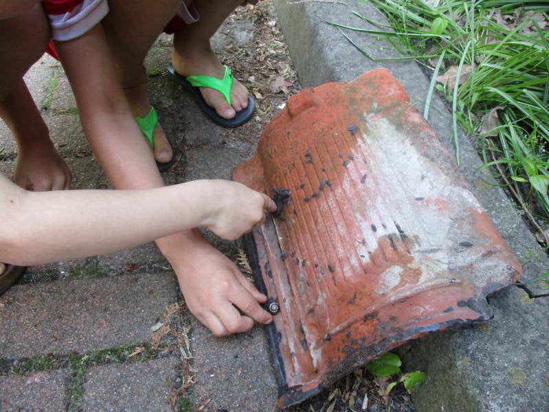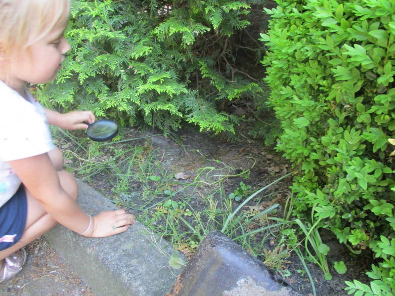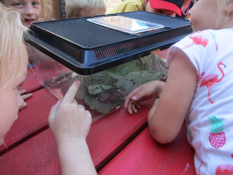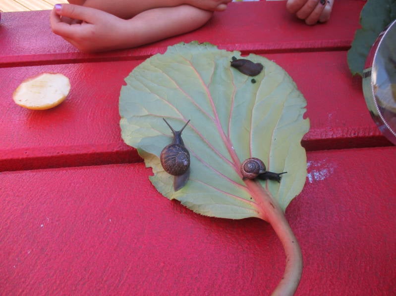 Buiten mochten de kinderen proberen om slakken op te sporen. Het was een warme dag, je raadt het zeker al wel, een lastige klus. slakken gaan zich verstoppen. Gelukkig zaten er in de tuin bij Astrid vele slakken dichtbij de vijver.