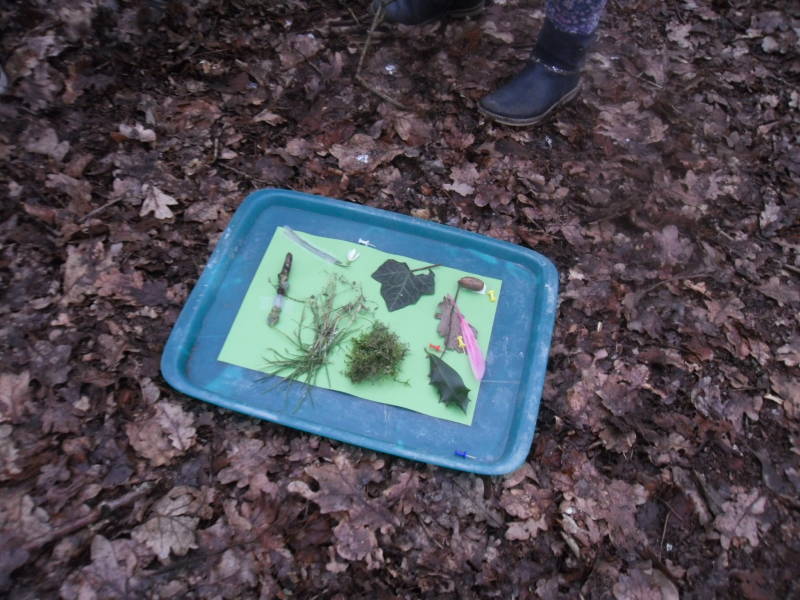 Kinderen rennen van A naar B als het om een speurtocht gaat. Ik had allerlei gekleurde veertjes aan bomen opgehangen. De opdracht was zoek 8 dingen op die op deze foto te zien zijn. Ieder kind kreeg een gekleurd bakje mee, om daar de natuurmaterialen in te bewaren. Nou.. sommige kinderen hebben hun bakje wel 3x moeten vullen. Telkens vielen de blaadjes etc. uit hun bakjes. Zo druk hadden het met struinen en ontdekken.