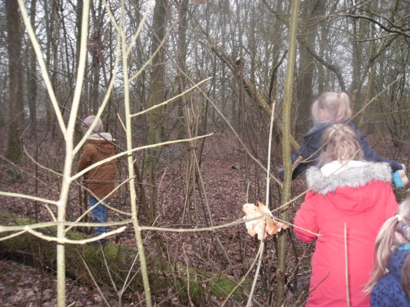 Een fotopuzzeltocht door het bos. Op de fotokaartjes met een rode rand was een opdracht aan verbonden. Zoals deze foto hierboven. Welke vogel is hier geweest? Tijdens de tocht ontdekten ze zelf al heel snel allerlei sporen. Goed bezig dus.