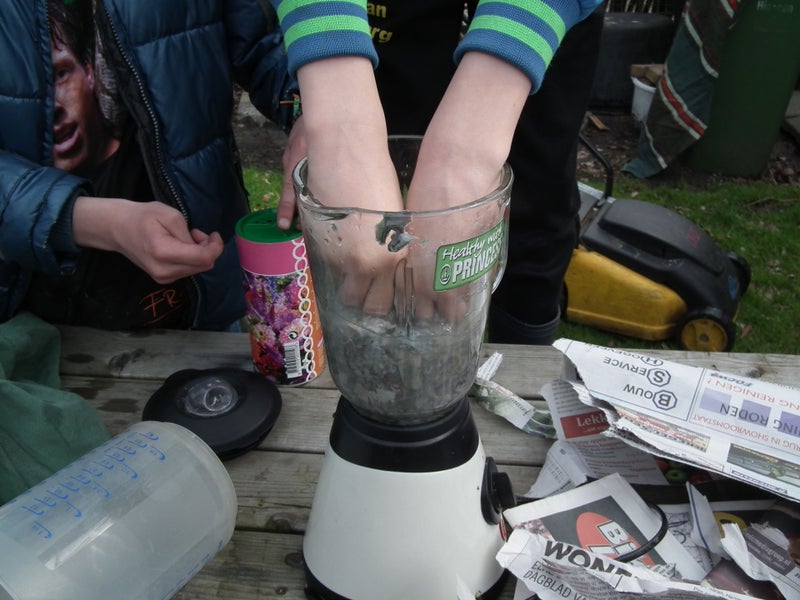 Daarvoor hebben we kranten nodig en gelukkig hadden de kinderen veel meegenomen. Met een blender vermengde wij de kranten met water tot een papje. De zaadjes kwamen erbij en het overtollig water moest er nog uit. Vervolgens kon het mengsel in de vormpjes worden gedrukt. Nog 1 a 2 dagen drogen en ze zijn klaar om te bombarderen!