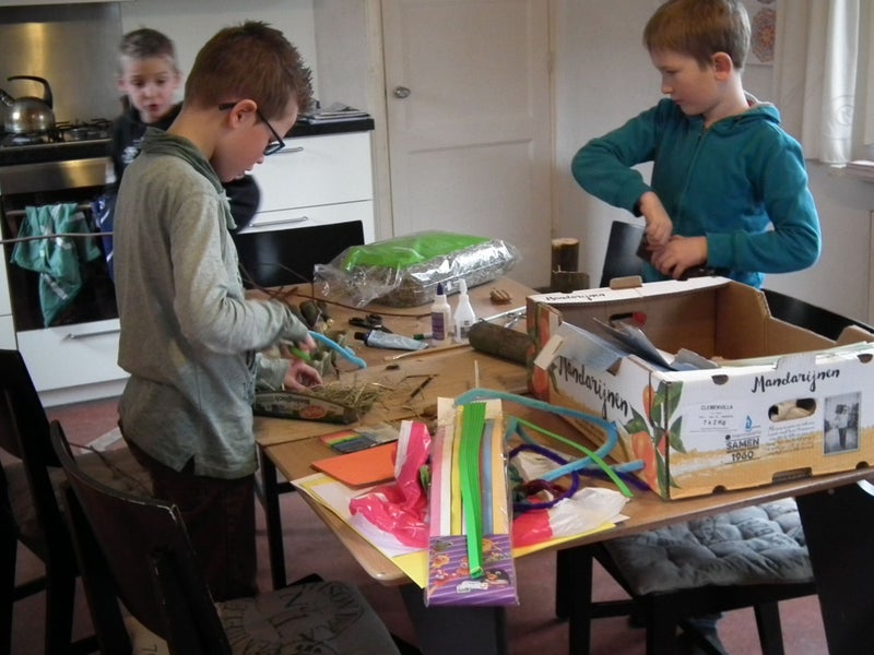 Om ons huis heen staat diverse nestkasten. Deze hebben met de kinderen schoon gemaakt, ze zijn weer klaar voor gebruik. In 2 nestkasten vonden wij nog nestjes van vorig jaar. Vogels zoeken inderdaad allerlei materialen op als stukjes stof. Dit troffen wij aan in de nesten van koolmezen. De jongens gingen stoer met Bamboestokken "vechten". Zo gaat het ook wel in de natuur. Twee mannetjes vechten om het vrouwtje.
