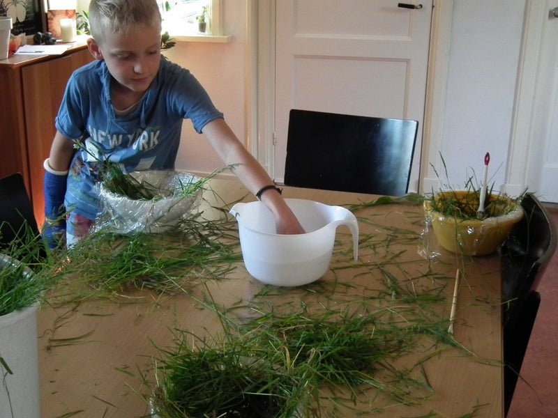 De kinderen hadden grootste lol, een leuke activiteit om met kinderen te doen. Wat is het ook heerlijk om met je handen te kneden in de sappige brei. En wat gebeurt er als je een zaadje opeet? Zal er dan bloemen uit je oren en neus groeien! Het idee alleen al. Toch stopten de kinderen een zaadje in hun mond, die vervolgens snel weer in het gras werd uitgespuugd..